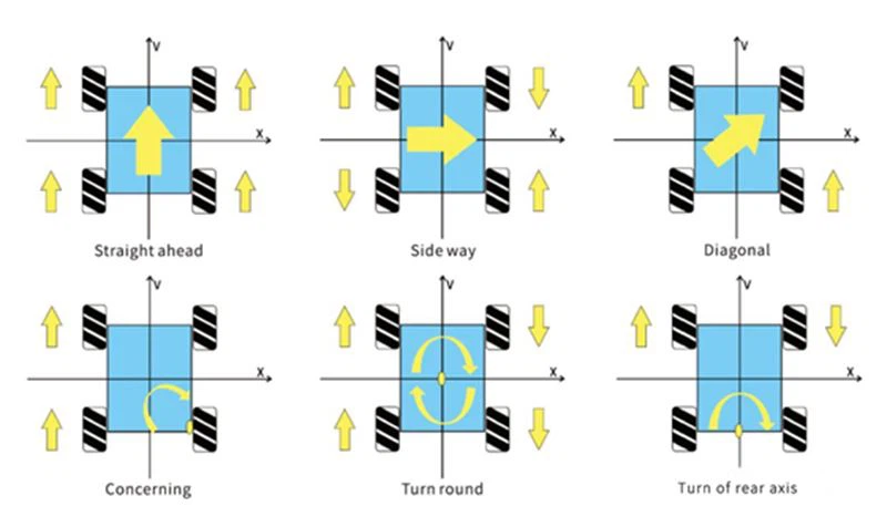 El modo de operación se divide en movimiento hacia adelante, movimiento hacia atrás, traducción a la izquierda, traducción a la derecha, la rotación in situ se puede lograr mediante el control remoto en los cuatro cambios de ruedas Mecanum integrados.